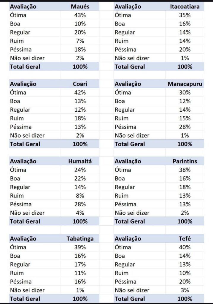 A enquete também apontou que a maior rejeição foi registrada em Manacapuru, onde a prefeita Válcileia Maciel (MDB) obteve 43% de avaliação negativa e apenas 42% de aprovação somando “ótimo” e “bom”.