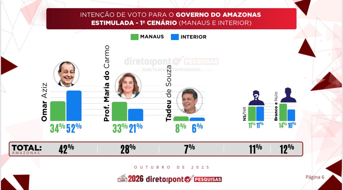 Por outro lado, o senador Omar Aziz (PSD) apresentou queda de 3 pontos, saindo de 45% para 42%. Brancos e nulos somam 12%, e 11% dos entrevistados não souberam responder. Os dados confirmam outras pesquisas de consumo interno que apontam o desejo de mudança da grande maioria da população, que já não acredita nos grupos políticos que estão há anos no poder, sem que a qualidade de vida melhore no Estado. A pesquisa também analisou a preferência ideológica dos entrevistados, onde 32% afirmam se identificar como de direita, enquanto 11% se consideram de esquerda. Outros 21% disseram ser de centro. Já 31% afirmaram não se identificar com nenhuma dessas correntes, enquanto 5% dos entrevistados não souberam responder. O Direto ao Ponto ouviu 2.024 eleitores de forma presencial de 1 a 8 de outubro, em Manaus e em outros 16 municípios do interior do Amazonas: Autazes, Careiro, Coari, Itacoatiara, Iranduba, Manacapuru, Manicoré, Maués, Parintins, Presidente Figueiredo, Rio Preto da Eva, São Paulo de Olivença, Tefé, Novo Airão, Tabatinga e Humaitá. A margem de erro é de 2,25 pontos percentuais, para mais ou para menos, com nível de confiança de 95,5%.FOTO – Assessoria MCIMAGEM – Direto ao Ponto Pesquisas